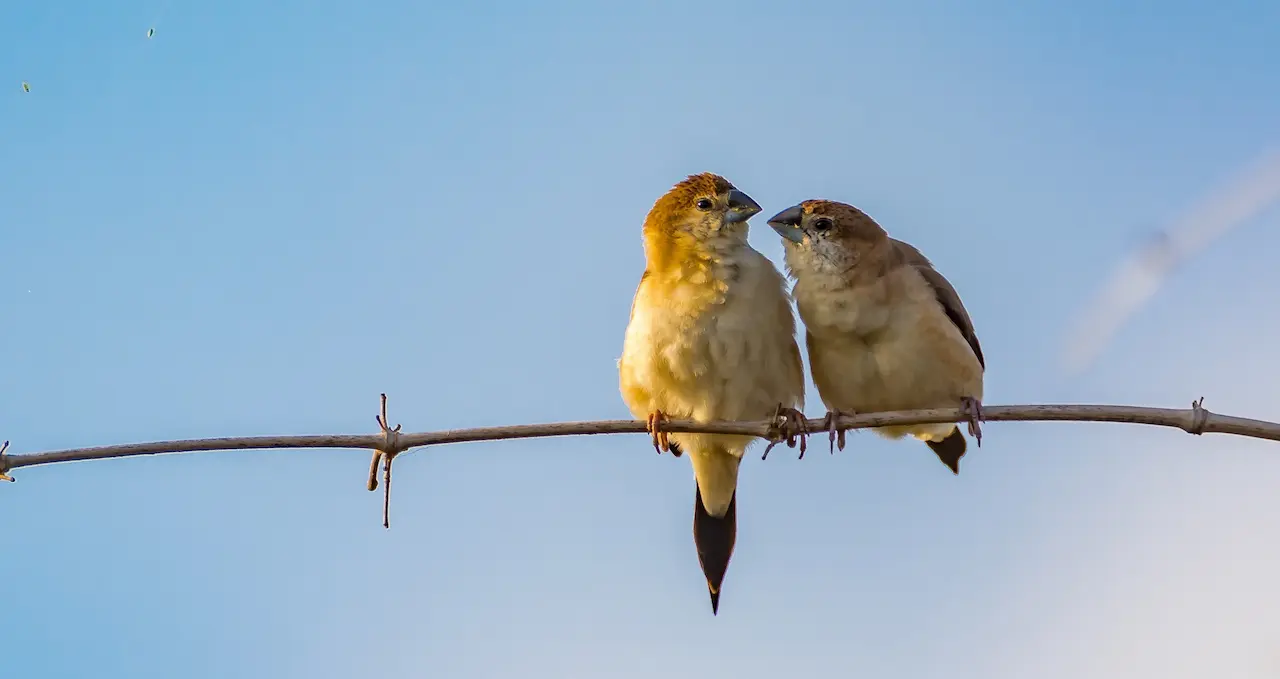 The Indian Silverbill is a tiny gregarious bird which feeds mainly on seeds. It frequents dry open country and cultivation, especially near water.