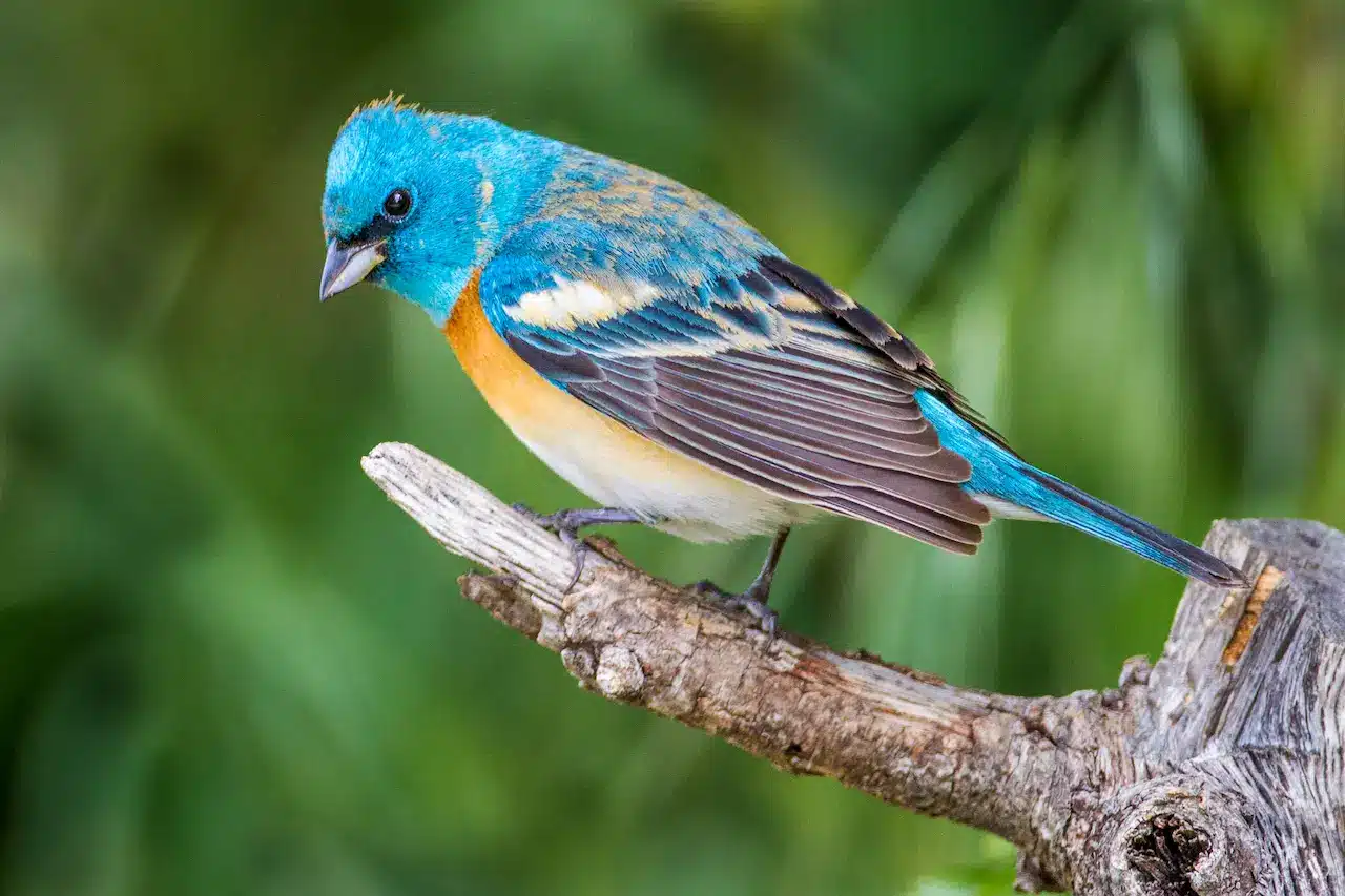 The Lazuli Bunting is a small songbird that measures about 5.1 – 5.9 inches or 13 – 15 cm in length (including the tail); and weighs between 0.5–0.6 oz or 13–18 g.