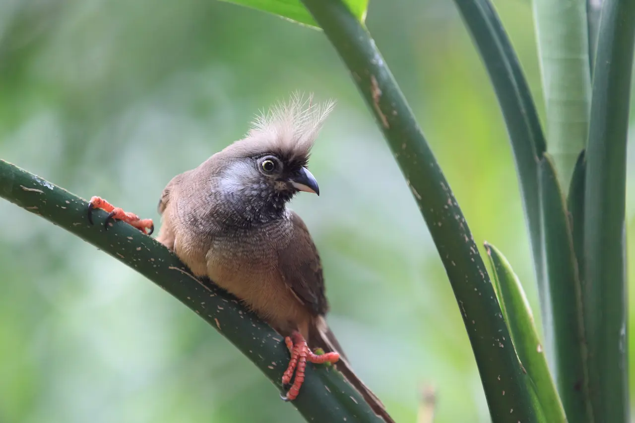 The legs and feet are dark pinkish-red. All members of the mousebird family have strong feet that are relatively large for their body size and are widely spaced. Unlike other birds, they are able to rotate all four toes to face forward allowing them to feed upside down, hold food with their feet, and perch with their legs positioned at strange angles.